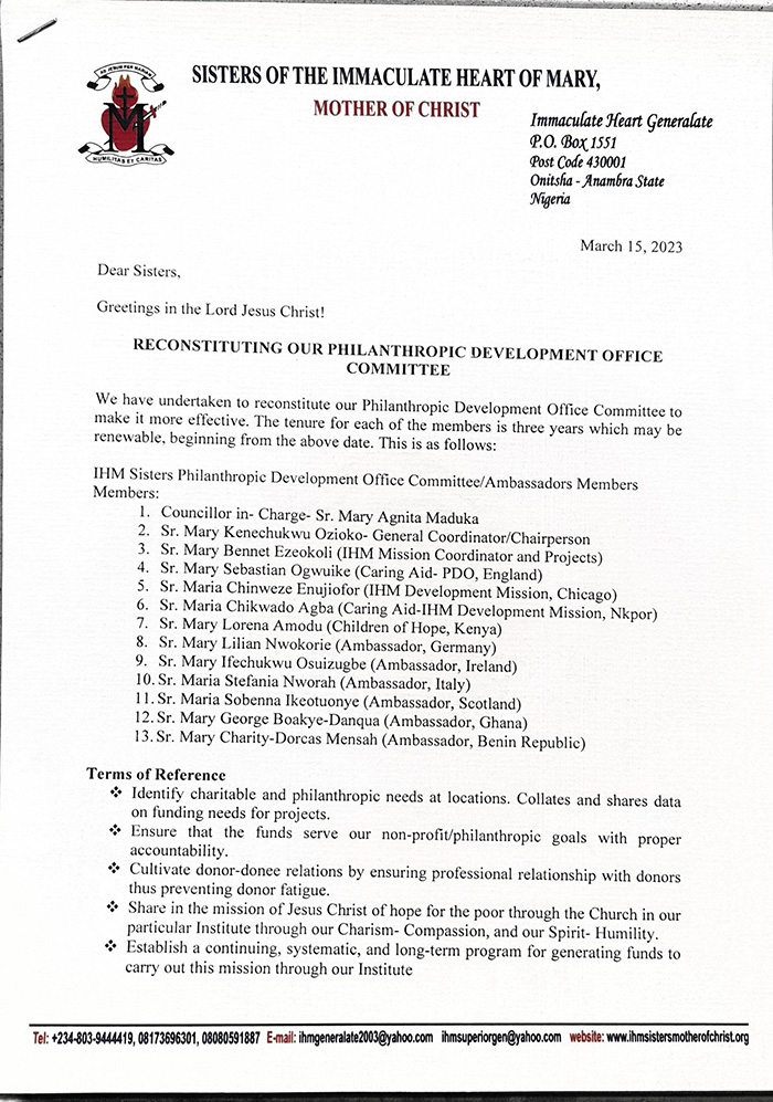 We are here to bring the Compassion of Christ through the most pure Heart of Mary by serving the people of God – the poor, and the less privileged starting here in Africa and all over the world.